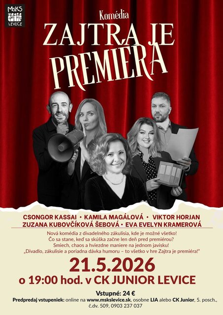 Komédia Zajtra je premiéra prináša nečakané situácie, do ktorých vás vtiahnu Kamila Magálová, Zuzana Kubovčíková Šebová, Eva Evelyn Kramerová, Viktor Horján a Csongor Kassai.